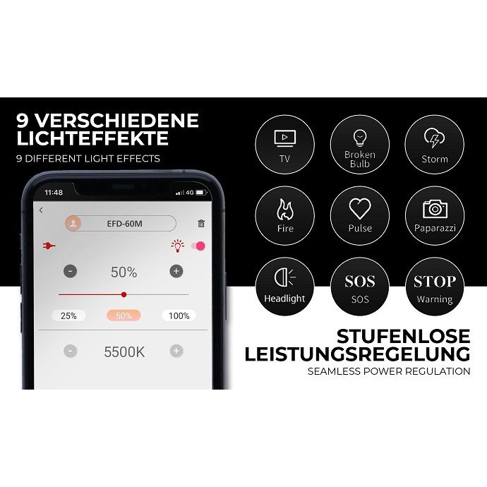 💥ƯU ĐIỂM: 👍 1. Với CRI >97 và TLCI thậm chí >98 cho phép kết xuất màu sắc đặc biệt tự nhiên cho ảnh và video của bạn 👍 2. EFD-60M có công suất 60w, ánh sáng đèn led chuẩn nhiệt độ màu 5500K 👍 3. Hiệu ứng ánh sáng: FX1: TV; FX2: Bóng đèn bị lỗi; FX3: giông bão; FX4: ngọn lửa; FX5: xung nhịp; FX6: tay săn ảnh; FX7: chùm tia cao / thấp; FX8: SOS; FX9: đèn cảnh báo