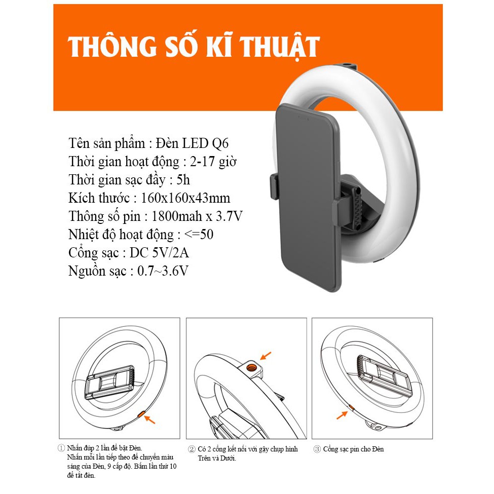💥Thông số kĩ thuật Tên : Đèn Ring LED Q6 Thời gian hoạt động : 2h - 17h Thời gian sạc đầy : 5h Kích thước : 160x160x43mm Thông Số Pin : 1800mah x 3.7V Nhiệt độ hoạt động : <=50 Cổng sạc : DC5V/2A Nguồn sạc: 0.7~3.6V Xuất xứ : China