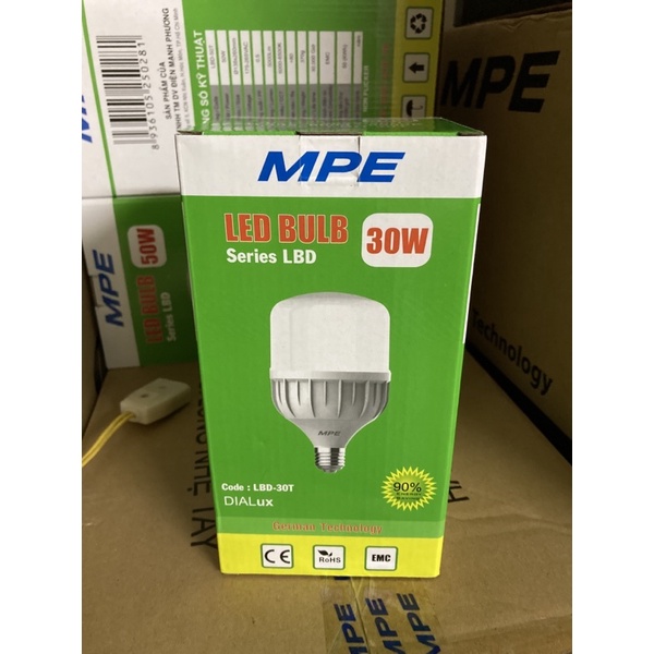 Đèn led trụ 30w MPE trắng Đèn led bulb trụ 30w MPE Đèn Led Bulb LBD-30W với 2 mã hàng: LBD-30T, LBD-30V có cùng mức giá 189.400 đồng Quang thông: 3.000 lm Đèn led bulb trụ 30w MPE Đèn led bulb trụ 30w MPE Tuổi thọ bóng: 30.000 giờ Đèn led bulb trụ 30w MPE LBD-30T Đèn led bulb trụ 30w MPE LBD-30T Nhiệt độ màu (CCT): 2800-3200K/6000-6500K. Ánh sáng vàng, trắng. Ánh sáng liên tục, tốt cho thị lực Đèn led trụ 30w MPE trắng Tiêu chuẩn châu Âu CE - RoHS Đèn led bulb trụ 30w MPE Điện áp: 176-265VAC Đèn led bulb trụ 30w MPE LBD-30T Đui đèn: E27 Đèn led trụ 30w MPE trắng Trọng lượng: 166g Đèn led trụ 30w MPE trắng Chip LED: SMD2835 Đèn led trụ 30w MPE trắng RA >80 Chỉ số hoàn màu cao