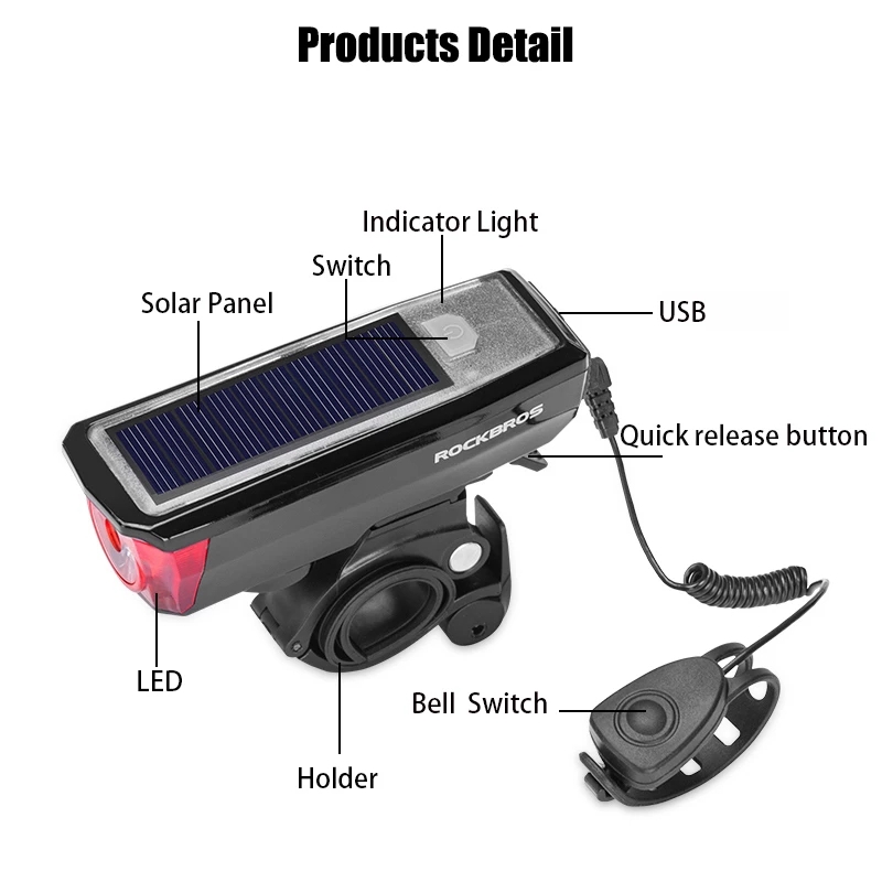 Đặc trưng sản phẩm Usb có thể sạc lại Đèn xe đạp sáng để giữ an toàn cho bạn Còi xe đạp điện 120 db Ipx4 chống thấm nước Bảng điều khiển năng lượng mặt trời sạc tự động