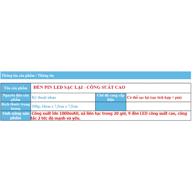 Giới thiệu Đèn pin cầm tay sạc lại, 9 Led công suất cao