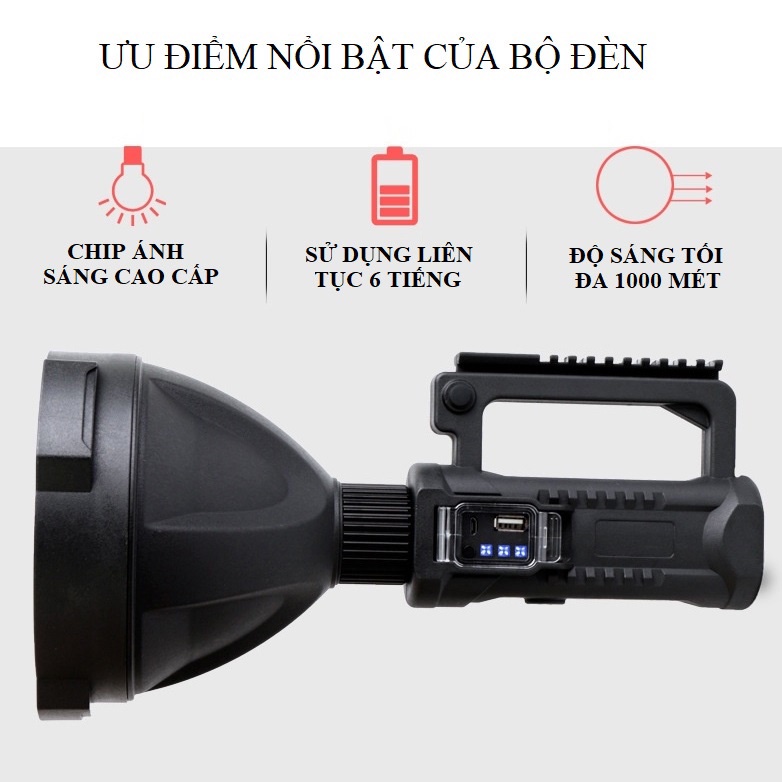 Giới thiệu Đèn pin cầm tay siêu sáng chiếu xa 1000m, chống thấm, chống nước có chân đế, tích hợp sạc dự phòng pin 6600mAh
