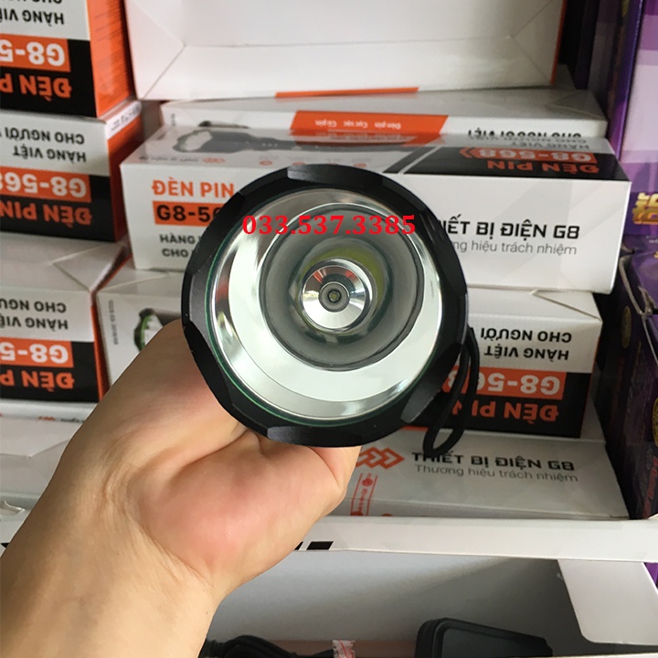 Tự hào thương hiệu Việt - Đèn pin cầm tay G8-568 hợp kim nhôm siêu sáng, siêu bền THÔNG SỐ KỸ THUẬT - Vỏ đèn làm bằng hợp kim nhôm siêu bền, chống va đập - Có gioăng, chụp silicone giúp chống thấm nước - Sử dụng pin Lithium dung lượng cao 3000mAh, - Thời gian chiếu sáng liên tục 5h ở chế độ sáng vừa, 1.5h ở chế độ sáng mạnh - Bóng Led Luxeon siêu sáng, tuổi thọ lên đến 10.000 giờ - Đèn pin mini có 3 chế độ chiếu sáng: Sáng mạnh - Sáng vừa – Sáng nhấp nháy (dùng trong trường hợp khẩn cấp) - Sản phẩm sử dụng pin điện áp 4.2V thông qua cục sạc đi kèm - Bộ đèn bao gồm: 1 đèn, 1 củ sạc, 1pin - Cục sạc thông minh tự ngắt khi đầy pin. Có đèn báo màu đỏ khi đang sạc, có đèn báo màu xanh khi đầy pin. - Điện áp vào 200-250V/50Hz - Đèn pin cầm tay siêu sáng sản xuất mới 100%, tuổi thọ dài, an toàn khi sử dụng - Có thể sử dụng đèn làm đèn tự vệ, dự phòng