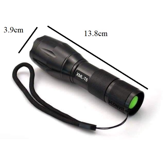 THÔNG TIN SẢN PHẨM: Model: XML T6 NEW Sản Phẩm được Shop ĐẠT HÀNG TRỰC TIẾP nên đảm bảo CHẤT LƯỢNG PIN VÀ BỘ SẠC Loại Bóng: Cree XM-L T6 Ánh Sáng: Trắng mát Độ Sáng: 1000 lumens maximum (Thông số từ nhà SX) Pin: 1 x 18650 hoặc 3 x AAA Chế Độ Sáng: 5 chế độ (Mạnh-Vừa-Yếu-Chớp-SOS) Điện áp: 3.6~4.2V Loại Công Tắc: Nút Bấm Vị Trí Công Tắc: Nắp sau Màu: Đen Chất Liệu Vỏ Đèn: Hợp Kim Nhôm Kính: Thấu Kính Lồi Zoom: X2000 Chiếu Xa: 500m Tuổi Thọ Bóng: 10,000giờ Trọng Lượng: 125g Kích Thước: 14 cm x 3.0 cm x 2.5 cm -------------------------------------------------------------------