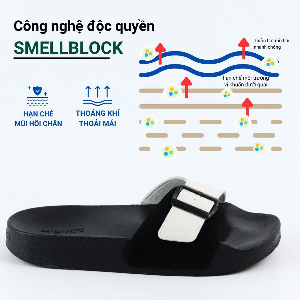 *SmellBlock của Hishoo là một công nghệ tiên tiến được áp dụng trong quá trình gia công da động vật. SmellBlock giúp giảm bớt mùi hôi trên da bàn chân và mang lại cảm giác thoải mái, khô ráo cho bàn chân của bạn. Công nghệ này còn giúp tạo sự thoáng thích và thông gió cho đôi dép của bạn, giúp thoát nhiệt, hơi ẩm và đánh bay mồ hôi. Đặc biệt, SmellBlock giúp khử mùi hôi cả ngày dài mà không cần phải lo lắng về mùi hôi khó chịu từ đôi chân của bạn.