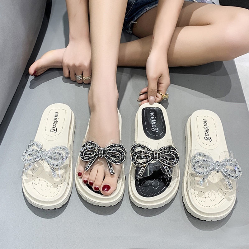 [Hoàn Tiền nhanh] Mùa hè 2022 dép phong cách mới phụ nữ đế dày nơ đáy rhinestone mặc bên ngoài siêu lửa dép đi biển và dép đi trong nhà phụ nữ xu hướng