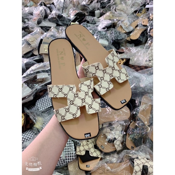 Giới thiệu dép HM quai chữ GG nền vàng đầu vuông cực xinh.. bao bền đẹp. nắng mưa đều mang được. cam kết như hình. ( hình tự chụp )