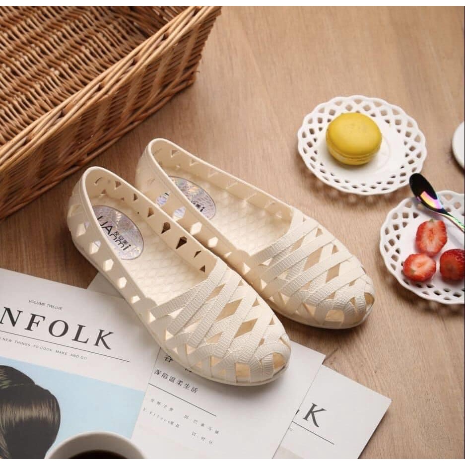 Giới thiệu Dép nhựa dẻo WOMENSTORY sandal cao su non đi biển chống trơn đế bằng sục nữ bánh mì đan dây mùa hè thoáng mát