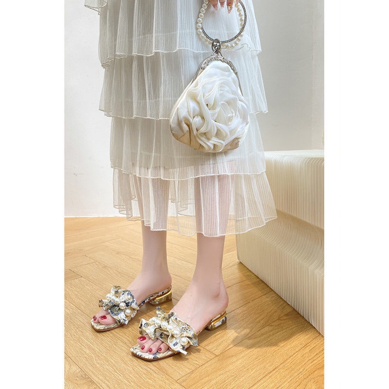 [Hoàn Tiền nhanh] Dép cao gót dày ngọc trai kiểu cổ tích và dép nữ mùa hè mặc dép đế bằng phẳng thời trang dép một từ 2022 mới mùa hè