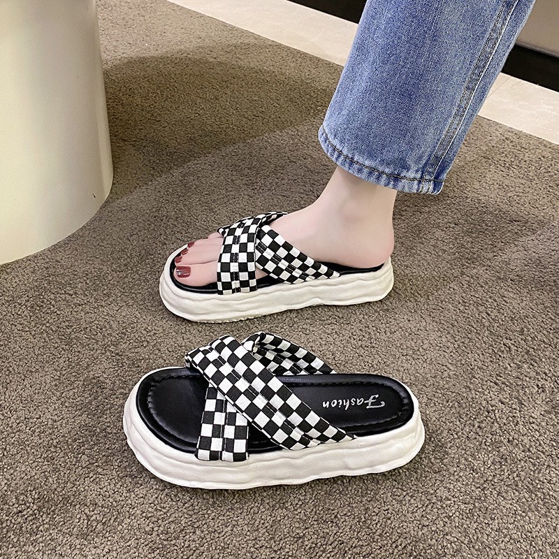 Giới thiệu Dép thời trang nữ CR quai chéo hoạ tiết caro đế 4cm màu lót kem/lót đen