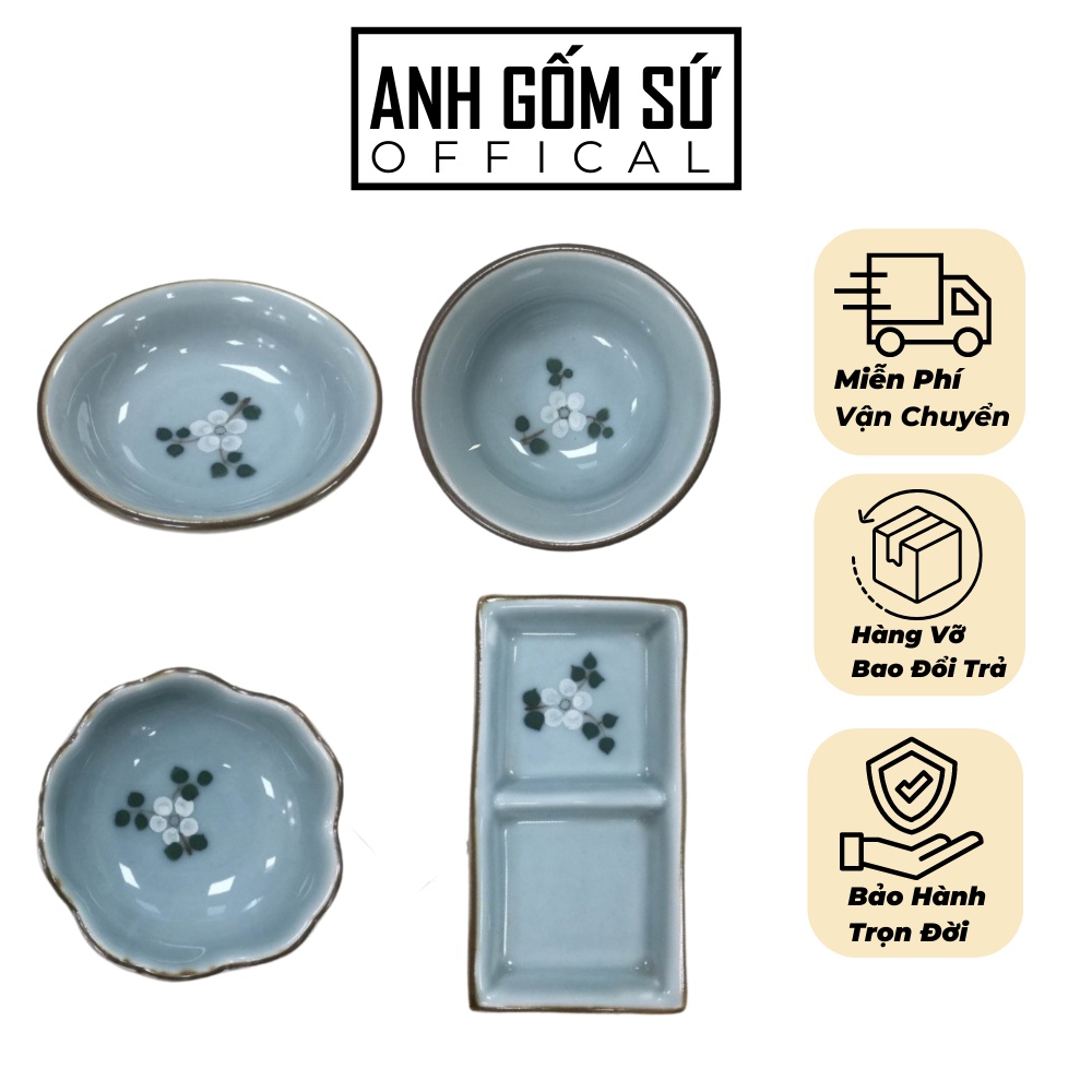 Thông tin sản phẩm - Sản phẩm: Đĩa đựng gia vị - Thương hiệu Bát Tràng - Chất liệu Men sứ sáng bóng, màu sắc nhã nhặn, cao cấp Họa tiết Hoa anh đào trắng nổi bật trên nền men xanh ngọc tinh tế Khả năng chịu nhiệt Dùng được trong lò vi sóng, máy rửa bát Lưu ý Tránh va đập mạnh