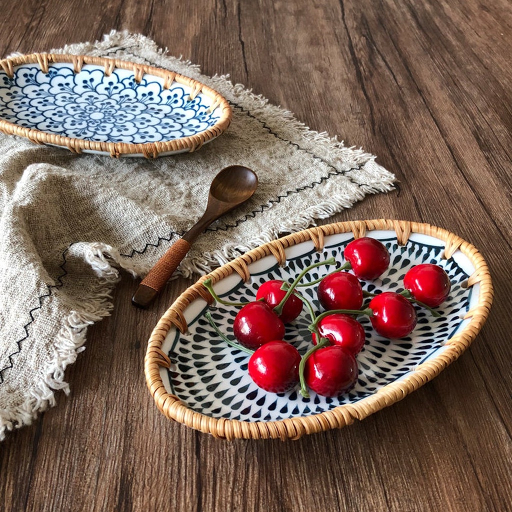 Đĩa sứ viền mây, khay gốm sứ viền mây ECOHUB, đựng đồ trang sức, bộ quà tặng nhà mới (Rattan Decorative Tray)