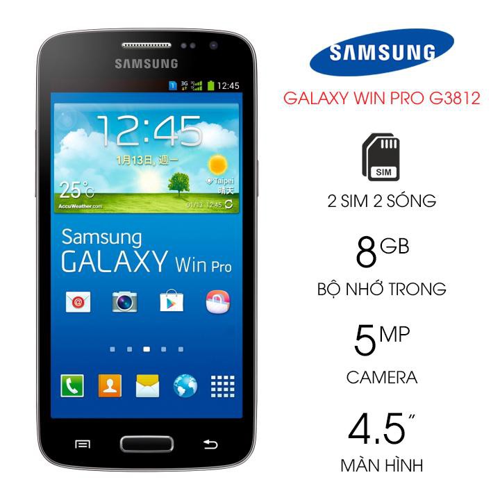 Galaxy Win Pro G3812 được ra mắt vào tháng 12 năm 2013, máy được trang bị hệ điều hành Android 4.2, CPU 4 lõi với tốc độ 1.2 GHz cho trải nghiệm khá tốt. Đây là một dòng Smartphone hỗ trợ 2 sim 2 sóng, máy sở hữu bộ nhớ trong 8GB (4GB có thể sử dụng) và có khả năng nâng cấp với 1 khe thẻ nhớ microSD tối đa 64GB.