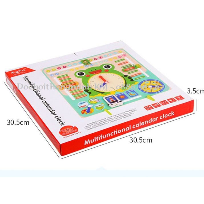 Đồng hồ lịch chứa tất cả 9 công năng trực quan sinh động mà mình rất tâm đắc: 1. Giúp trẻ làm quen với khái niệm thời gian, học cách xem giờ và điểu khiển mũi tên giờ, phút một cách chính xác, trực quan dễ hiểu nhất mà bé có thể thực hành ngay tại chỗ, hàng giờ, hàng ngày cho đến khi nhuần nhuyễn về thời gian. 2. Giúp trẻ nhận biết hôm nay là thứ mấy, khái niệm về hôm qua, hôm nay, ngày mai... 3. Giúp trẻ nhận biết ngày chuẩn xác bằng con số tương ứng. 4. Giúp trẻ nhận biết các tháng trong năm, một năm 12 tháng và chia theo quý, theo mùa như thế nào. 5. Trẻ sẽ học được khái niệm về từng buổi trong một ngày khác nhau như thế nào, đặc điểm đặc trưng của từng buổi mà bé đang được trải nghiệm mỗi ngày. 6. Trẻ sẽ học được các mùa trong 1 năm, đặc điểm tự nhiên của 4 mùa và các tháng nào tương ứng với mùa nào. 7. Trẻ sẽ được làm quen với khái niệm thời tiết, khí hậu cơ bản đặc trưng trong 1 ngày, có mưa, nắng, nhiều mây, nhiều gió v.v...,rèn luyện khả năng quan sát thiên nhiên, miêu tả và cách con người thích nghi, áp dụng vào thực tế theo mỗi hình thái thời tiết. 8. Đặc biệt, tất cả mọi thông tin đều được hiển thị bằng tiếng Anh, trẻ sẽ được học và gọi tên mỗi thông tin trong ngày, trong tháng, trong năm bằng tiếng Anh, đây là cách học dễ nhớ nhất, trực quan nhất mà ba mẹ ko phải tốn quá nhiều công sức để bày vẽ bé. 9. Ngoài ra, trẻ còn được học về màu sắc, số đếm, luyện tập khả năng quan sát thiên nhiên, gần gũi với mẹ thiên nhiên kỳ diệu quanh bé, từ đó dạy bé biết quý trọng thời gian, tận dụng quỹ thời gian của mình để làm những việc hữu ích. Đồng hồ đa năng với thiết kế hình chú Ếch xanh ngộ nghĩnh, màu sắc hiển thị theo các thông tin rõ ràng rất dễ phân biệt, bảng được thiết kế 5 lớp dày và chắc chắn, đảm bảo bé con nào nhìn vào cũng sẽ thích.