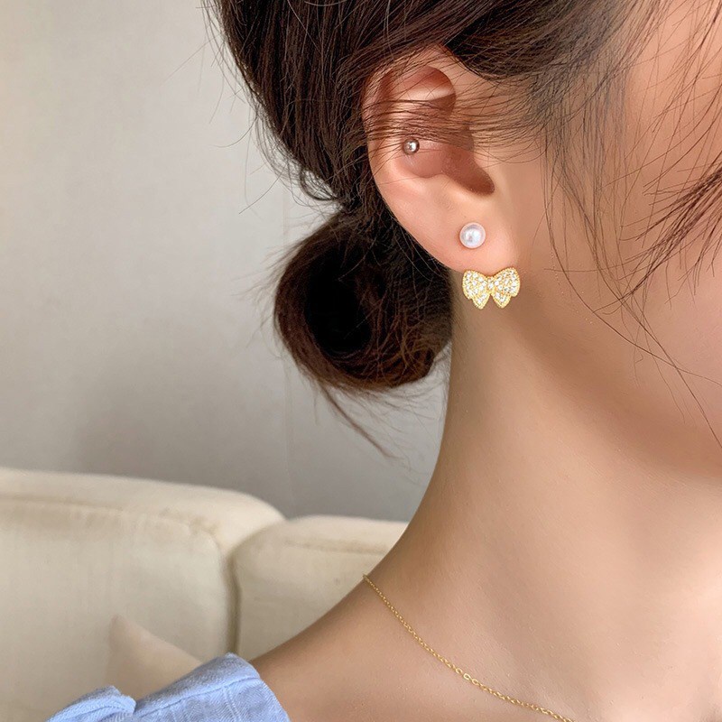 Giới thiệu Đôi khuyên tai chốt xỏ bạc S925 mặt nơ đính đá và ngọc trai nhân tạo thời trang cho nữ
