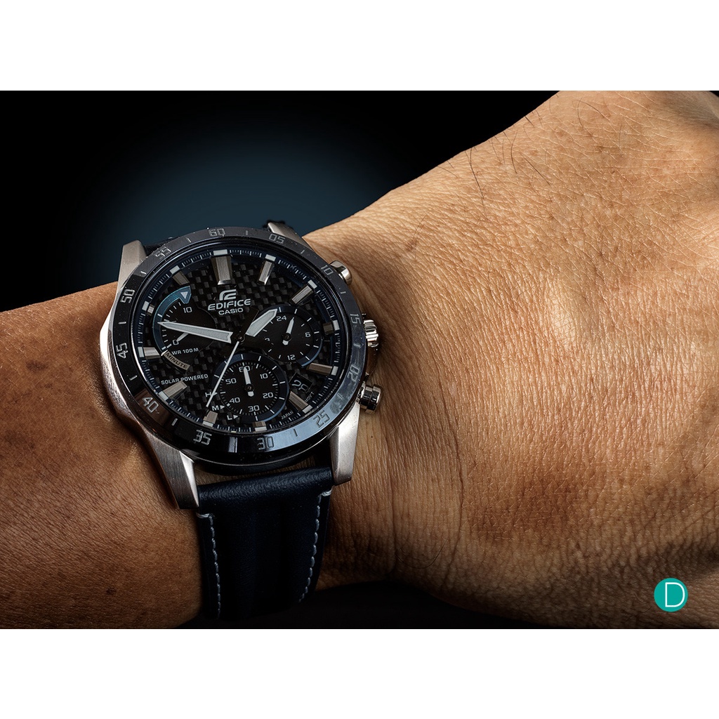 Đồng hồ ghi thời gian chạy bằng năng lượng mặt trời mới này có mặt số sợi carbon tượng trưng cho chủ đề đua xe thể thao của dòng sản phẩm EDIFICE. Màu sắc dễ nhìn của kim giây là kết quả của phản hồi từ các kỹ sư đua xe. Công nghệ năng lượng mặt trời phân tán và che chắn ánh sáng nguyên bản của CASIO giúp bạn có thể tạo ra đủ năng lượng chỉ bằng cách sử dụng ánh sáng đi qua ba mặt số nhỏ. Pin được sạc đầy bằng cách tiếp xúc với ánh sáng cung cấp năng lượng cho các hoạt động thông thường trong năm tháng.