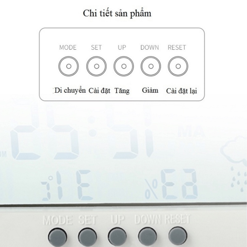 ✅Đồng Hồ Báo Thức Điện Tử LCD Trong Suốt Để Bàn Có Đèn LED Nền Hiển Thị Lịch, Nhiệt Độ - Độ Ẩm (tặng kèm pin) —-------------------------------------------------------------------------------------- ✅ THÔNG TIN SẢN PHẨM - Chất liệu: Nhựa + màn hình LCD - Màu sắc: đen, trắng, hồng - Pin: AAA - Kích thước: Dài * Rộng * Cao: 13 * 3 * 7cm - Sản phẩm gồm: 1 đồng hồ + 1 vỏ hộp + 1 giấy hướng dẫn —-------------------------------------------------------------------------------------- ✅ HƯỚNG DẪN SỬ DỤNG 1. Cài đặt thời gian - Sau khi lắp pin, màn hình nhấp nháy, nhấn UP/DOWN để chọn định dạng 12/24 giờ - Nhấn SET để xác nhận và nhập cài đặt giờ, nhấn UP/ DOWNđể chọn; nhấn SET lại để xác nhận vào cài đặt phút, nhấn UP/ DOWN để chọn. - Nhấn MODE để xác nhận và thoát cài đặt để vào giao diện chính. 2. Điều chỉnh thời gian mỗi ngày - Trong giao diện chính, nhấn và giữ SET, màn hình nhấp nháy, nhấn LÊN / XUỐNG để chọn định dạng 12/24 giờ - Nhấn SET để xác nhận và nhập cài đặt giờ, nhấn UP/ DOWN để chọn; nhấn SET lại để xác nhận vào cài đặt phút, nhấn UP/ DOWN để chọn - Nhấn MODE để xác nhận và thoát cài đặt để vào giao diện chính 3. Cài đặt ngày - Trong giao diện chính, nhấn MODE hai lần để hiển thị năm hiện tại. - Nhấn và giữ lại SET, màn hình nhấp nháy, vào năm cài đặt. nhấn UP/DOWN để điều chỉnh năm - Nhấn SET để xác nhận và nhập cài đặt tháng, nhấn UP/DOWN để điều chỉnh tháng - Nhấn SETđể Xác nhận và nhập cài đặt ngày, nhấn UP/ DOWN để điều chỉnh trong ngày - Sau khi cài đặt hoàn tất, nhấn MODE để xác nhận và thoát cài đặt. Thứ trong tuần được tự động hiển thị. 4. Cài đặt báo thức - Ở chế độ giao diện chính, nhấn mode để vào chế độ báo thức (màn hình hiển thị ALM) - Nhấn và giữ SET trong 2 giây để vào chế độ cài đặt báo thức bấm UP/DOWN để đặt giờ. - Nhấn SET để đặt phút - Nhấn MODE để thoát và quay trở lại giao diện chính. 5. Thời tiết - Bao gồm những ngày nắng, mây và mưa. - Hiển thị thời tiết theo xu hướng thay đổi nhiệt độ và độ ẩm (không phải thời tiết thực tế, chỉ mang tính chất tham khảo) - Khi độ ẩm được hiển thị như "-", không có hiển thị thời tiết. 💢 Lưu ý - Trong quá trình cài đặt, nếu bạn nhấn UP/ DOWN trong thời gian dài, số lượng sẽ tăng / giảm nhanh chóng - Trong quá trình cài đặt, nếu bạn nhấn LÊN / XUỐNG trong thời gian dài, số lượng sẽ tăng / giảm nhanh chóng —-------------------------------------------------------------------------------------- ✅ CHÍNH SÁCH BẢO HÀNH ▶️ KHÁCH LƯU Ý VUI LÒNG QUAY VIDEO KHI BÓC HÀNG Ạ. ▶️ Do màn hình khác nhau và hiệu ứng ánh sáng, màu sắc thực tế sản phẩm sẽ khác so với hình ảnh, vui lòng lấy sản phẩm thật làm tiêu chuẩn ▶️ Shop sẽ xử lý tất cả khiếu nại về đơn hàng, quý khách vui lòng cung cấp đầy đủ tờ bill, quay clip đầy đủ quá trình khui hàng ▶️ Khi nhận được hàng Quý khách vui lòng bỏ chút thời gian để đánh giá cho shop, để nhật được thêm nhiều ưu đãi cùng sự hỗ trợ tốt nhất. Cảm ơn Quý khách hàng! 👉 🍀