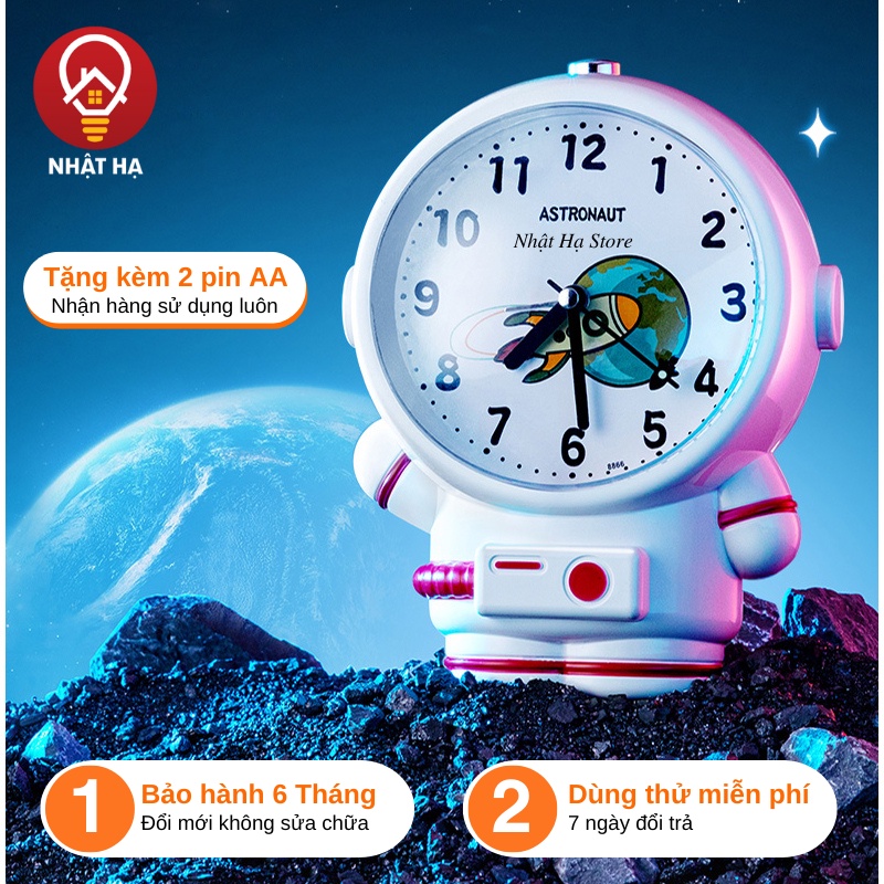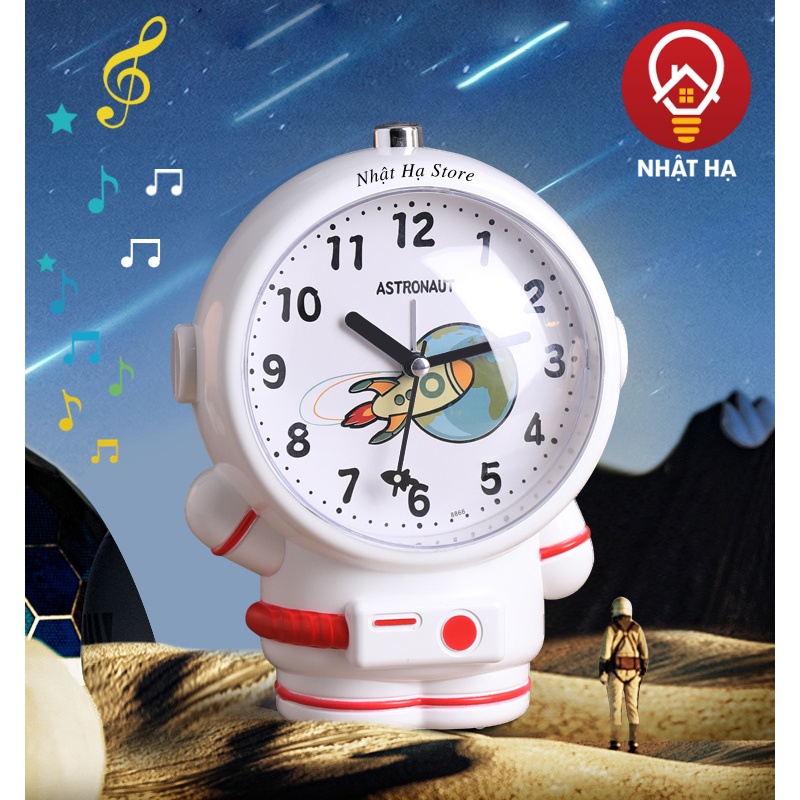 Đồng Hồ Báo Thức Phi Hành Gia Cute cho bé Decor trang trí bàn học - Âm báo thức kép, động cơ kim trôi có đèn