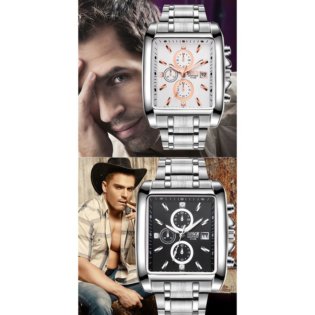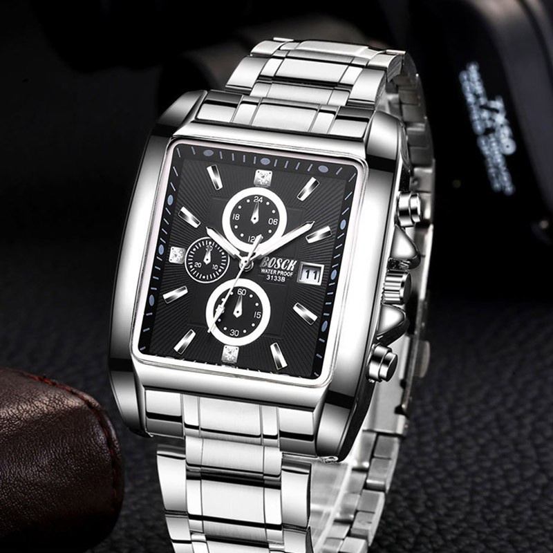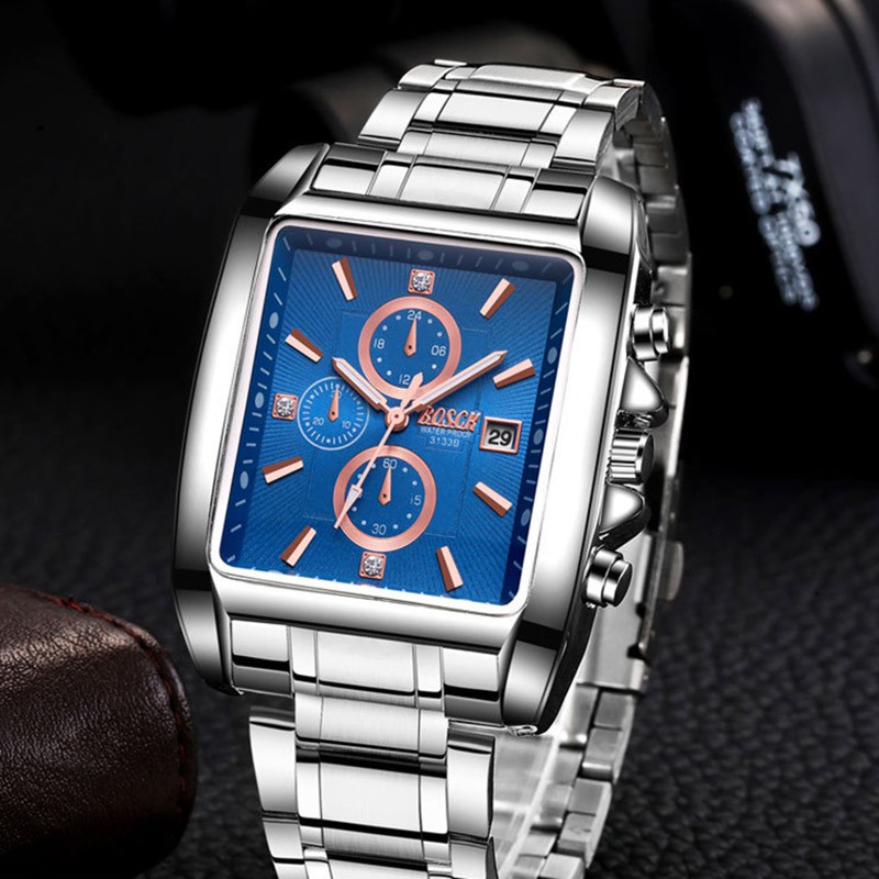 Giới thiệu Đồng hồ Bosck chính hãng dây kim loại không thấm nước mặt vuông cá tính hiển thị lịch ngày thời trang cao cấp cho nam