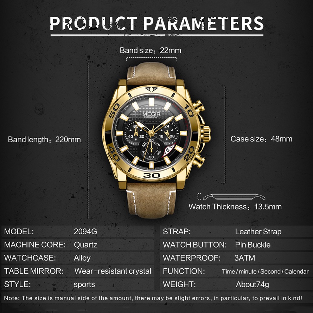 Mô tả sản phẩm ' Thương hiệu “ MEGIR Số mô hình “ MEGIR-2094 Phong cách ' Sang trọng Hình dạng trường hợp ' Tròn Phong trào - Thạch anh Loại sản phẩm ' Đồng hồ đeo tay thạch anh Loại vật liệu ban nhạc Chất liệu vỏ - Hợp kim Loại vật liệu cửa sổ quay số “ Hardlex Chiều dài dây đeo ' 24cm Chiều rộng dải × 24mm Đường kính quay số ' 48mm Độ dày vỏ x 13,5mm Trọng lượng ' 93g Độ sâu kháng nước — 3Bar Loại móc khóa