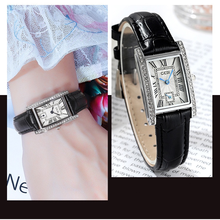 Thương hiệu: Gedi Model: 51025 Công dụng đặc biệt: trang trí Loại hiển thị: con trỏ Dành cho: nữ Không thấm nước: Có Hiệu suất chống thấm nước: 30M Loại máy đồng hồ: Quartz Thương hiệu máy đồng hồ: Nhật Bản MIYOTA Citizen Xuất xứ máy đồng hồ: Nhật Bản Model máy đồng hồ: PC21 Độ dày: 7mm Đường kính mặt đồng hồ: 22mm Chiều dài dây đeo: 230mm Chiều rộng dây đeo: 15mm Loại chốt vặn: chốt vặn xoắn ốc Loại đáy: bình thường Chất liệu mặt kính: kính cứng Phong cách khóa cài: khóa ghim Chất liệu khóa cài: thép không gỉ Chất liệu dây đeo: da Hình dạng mặt đồng hồ: hình chữ nhật Chất liệu vỏ: hợp kim Cách đóng gói: đóng gói riêng lẻ