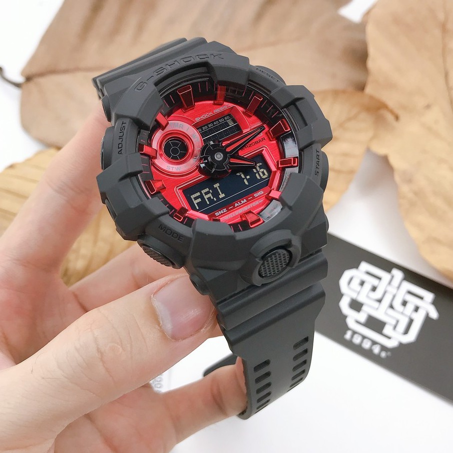 - Các tính năng: G-SHOCK, thương hiệu đồng hồ đã và đang đặt ra tiêu chuẩn về độ bền đồng hồ hiển thị giờ hiện hành từ năm 1983, thông báo ra mắt màu đỏ mới tràn đầy sinh lực. Mẫu cơ bản là mẫu GA-700 chắc chắn và táo bạo. Màu đen cơ bản của mẫu này được cân bằng với màu đỏ tươi để tạo nên thiết kế cứng cáp và hài hòa với thời trang đường phố hiện đại.