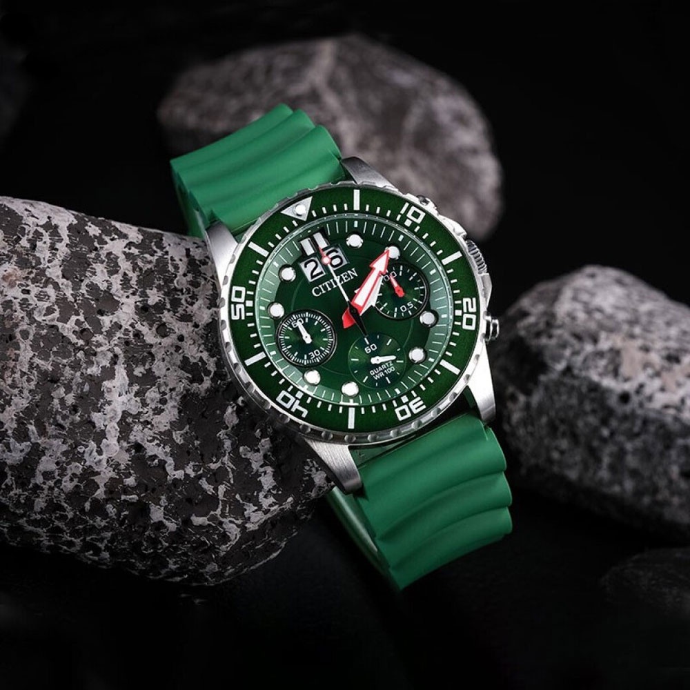 Đặc điểm nổi bật: - 100% đồng hồ Citizen chính hãng thương hiệu Nhật Bản. - 5 năm bảo hành bao gồm 1 năm chính hãng toàn cầu và 4 năm bảo hành tại hệ thống. - Công nghệ Pin thạch anh, giúp đồng hồ hoạt động từ 1.5 đến 2 năm trước khi cần thay pin. - Mặt kính cường lực với độ chịu lực cao, hạn chế tác động va đập. - Viền kim loại chất liệu thép không gỉ hạn chế ăn mòn cao. - Viền Bezel có thể xoay nhằm đo thời gian khi dưới nước. - Sở hữu chức năng Chronograph đếm giờ thể thao. - Dây cao su xanh cao cấp chính hãng Citizen. - Kim được phủ dạ quang phát sáng trong tối. - Chức năng lịch ngày. - Thiết kế thanh lịch. Thông số kỹ thuật: - Kích thước mặt: 43 mm - Độ rộng dây: 22 mm - Độ dày vỏ: 13 mm - Chống nước: 10 ATM (100M) thoải mái đi mưa, rửa tay, đi bơi (không dùng đi lặn) Hình thức bảo hành: - Sổ bảo hành Mô tả bảo hành: Pin: I. Tất cả Đồng Hồ CITIZEN đều được áp dụng chế độ bảo hành chính hãng 01 năm toàn cầu cộng thêm 04 năm tại Hệ Thống Store Đồng Hồ Citizen. • 1 Năm Bảo Hành Chính Hãng + 4 Năm Bảo Hành Tại Hệ Thống Store Đồng Hồ Citizen = 5 Năm Bảo Hành II. Chi tiết bảo hành 1. Đồng hồ được bảo hành trong các điều kiện sau: • Các linh kiện bị hư hại trong thời hạn bảo hành (ở bên trong máy). • Thay pin trong thời hạn còn bảo hành đối với khách hàng mua tại Việt Nam. 2. Những trường hợp không được bảo hành bao gồm: • Trầy xướt về dây hoặc mặt kiếng bị vỡ do va chạm trong quá trình sử dụng. • Sử dụng không hợp lý theo hướng dẫn của hãng, tự ý thay đổi máy móc bên trong, không cẩn thận hoặc do bị tai nạn… • Đồng hồ được sữa chữa ở những nơi không thuộc thẩm quyền của hãng. 3. Lưu ý • Đối với đồng hồ mỏng, Qúy khách nên hạn chế đeo khi tiếp xúc với nước. • Không đặt đồng hồ gần các thiết bị có từ tính, tiếp xúc với hóa chất và các chất ăn mòn. • Không đeo đồng hồ khi dùng nước nóng, xông hơi, tắm biển (trừ những loại đồng hồ dành cho chuyên dùng).