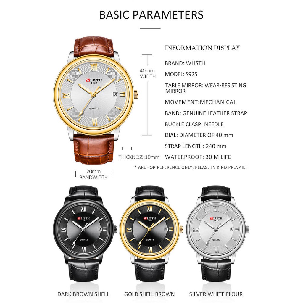 Đồng Hồ Nam Cơ Automatic Chính Hãng WLISTH Dây Da ------------------------------------------------- ❤ Đặc điểm cơ bản: ✔ Model: MQW-S925-RT ✔ Thương Hiệu: WLISTH ✔ Loại sản phẩm: Đồng hồ cơ tự động ✔ Kiểu dáng: Thời trang, đeo thoải mái. ✔ Chất liệu mặt đồng hồ: Kính khoáng cường lực ✔ Chất liệu vỏ: Hợp kim ✔ Chất liệu dây đeo: Da ✔ Loại Máy đồng hồ: Automatic ✔ Hình dạng vỏ: Tròn ✔ Đường kính mặt đồng hồ: 40mm ✔ Độ dày mặt đồng hồ: 10mm ✔ Chiều dài dây đeo: 240mm ✔ Khối lượng sản phẩm: 70g ✔ Chống thấm nước: 30m ( rửa tay, rửa mặt, đi mưa,...) ------------------------------------------------ ❤ Thông tin sản phẩm: Đặc điểm nổi bật: ✔ Kiểu dáng thời trang cổ điển và thiết kế bắt mắt. ✔ Dây đeo đồng hồ bằng da đẹp, gương kính chống xước, chống thấm nước 30m. ✔ Thời gian chính xác và giữ thời gian tốt, độ chính xác cao. ✔ Chất lượng cao và tiết kiệm chi phí. ✔ Dễ phối với mọi trang phục. ✔ Một món quà tuyệt với cho bản thân hoặc những người đàn ông mà bạn yêu thương. -------------------------------------------------- ❤ Hướng dẫn sử dụng: ✔ Cách lên dây cót khá đơn giản như sau: dùng tay xoay núm điều chỉnh theo chiều kim đồng hồ từ 15cvòng. Không nên xoay ngược chiều kim đồng hồ hoặc xoay quá căng nhằm tránh bị đứt dây cót và có thể gây ra hỏng máy. ✔ Để chỉnh giờ: Kéo núm điều chỉnh ra ở mức 1 và xoay để chỉnh giờ theo ý muốn. kéo ra mức 2 để điểu chỉnh ngày. Sau khi chỉnh giờ phải đẩy núm điều chỉnh về vị trí cũ. ✔ Lưu ý: Khi đồng hồ không sử dụng hoặc không lên dây cót trong khoảng 1 ngày, đồng hồ sẽ hết năng lượng và bạn phải lên cót lại từ đầu để đồng hồ tiếp tục hoạt động --------------------------------------------------- ❤ Bộ sản phẩm bao gồm: 1 x Đồng hồ cơ tự động WLISTH chính hãng cho nam 1 x hướng dẫn sử dụng 1 x Hộp đựng đồng hồ