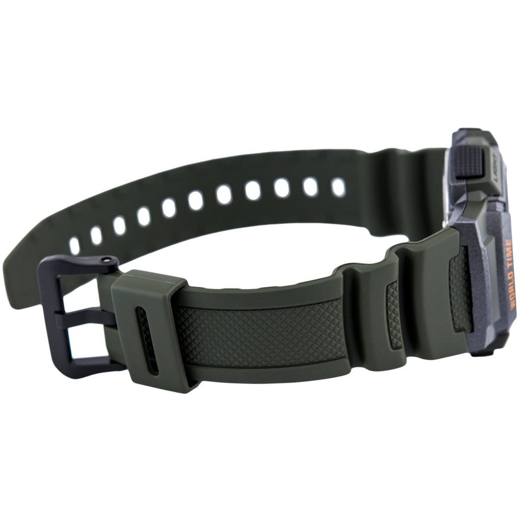 ĐẶC ĐIỂM KỸ THUẬT * Vật liệu vỏ / gờ: Nhựa * Dây đeo bằng nhựa * Mặt kính nhựa / Mặt kính hình cầu * Khả năng chống nước ở độ sâu 100 mét * Đèn LED Thời lượng chiếu sáng có thể lựa chọn, phát sáng sau * Nhiều múi giờ (4 thành phố khác nhau) * Giờ thế giới 31 múi giờ (48 thành phố + giờ phối hợp quốc tế), bật/tắt tiết kiệm ánh sáng ban ngày, Chuyển đổi thành phố Giờ chuẩn/Giờ thế giới * Đồng hồ bấm giờ 1/100 giây Khả năng đo: 23:59'59,99'' Chế độ đo: Thời gian đã trôi qua, ngắt giờ, thời gian về đích thứ nhất - thứ hai * Đồng hồ đếm ngược Đơn vị đo: 1/10 giây Khoảng nhập: 1 giây đến 24 giờ (khoảng tăng 1 giây, khoảng tăng 1 phút và khoảng tăng 1 giờ) * 5 chế độ báo giờ hàng ngày hoặc báo giờ một lần * Tín hiệu thời gian hàng giờ * Lịch hoàn toàn tự động (đến năm 2099) * Định dạng giờ 12/24 * Bật/tắt âm nhấn nút * Giờ hiện hành thông thường * Đồng hồ số: Giờ, phút, giây, chiều, tháng, ngày, thứ * Độ chính xác: ±30 giây một tháng * Tuổi thọ pin xấp xỉ: 10 năm với pin CR2025