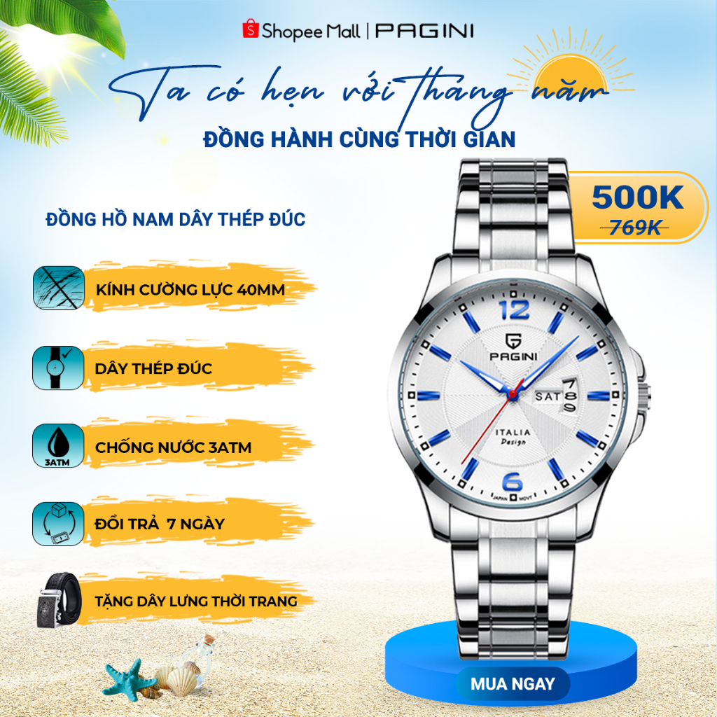 Giới thiệu Đồng Hồ Nam Pagini PA5533 dây thép đúc không gỉ cao cấp chống xước chống nước sang trọng Full Box
