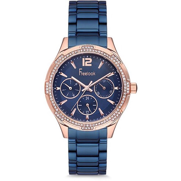 Một cỗ máy thời gian đa chức năng sẽ là một sản phẩm hiện đại mà mọi quý cô đều đang mong muốn tìm kiếm. Nắm bắt được xu hướng thời trang của phái nữ, Freelook cho ra mắt mẫu đồng hồ F.8.1089.06 thuộc BST Belle ấn tượng sẽ dễ dàng đáp ứng mọi nhu cầu của chị em. Sở hữu tông màu xanh cobalt cùng kiểu dáng thiết kế cá tính nhưng không đánh mất vẻ nữ tính, dịu dàng cần thiết. Trên nền mặt dial tròn, bên cạnh các chức năng chính như giờ, phút thì các cửa sổ chức năng như lịch thứ, lịch ngày và chức năng 24 giờ được hiển thị lần lượt, riêng biệt và thân thiện giúp các quý cô dễ dàng quan sát. Bảo vệ bộ máy bên trong là lớp kính Mineral có độ cứng hoàn hảo, có thể đánh bóng lại sau thời gian dài sử dụng có xước nhẹ. Kết hợp với màu xanh là màu mạ vàng hồng PVD của khung case đồng hồ. Thiết kế phần mặt vành đồng hồ khiến chúng ta liên tưởng đến bánh răng cưa và được trang trí mạ màu vàng hồng PVD và đính những viên đá pha lê cỡ nhỏ vô cùng tinh xảo. Toàn bộ khung vỏ và dây đeo đồng hồ được chế tác chủ đạo chất liệu thép không gỉ 316L, đây là chất liệu thép chuyên dùng trong y tế vô cùng lành tính và an toàn khi sử dụng lâu dài. Ngoài ra, đồng hồ F.8.1089.06 còn được trang bị mức độ chống nước 3 ATM, các hoạt động sinh hoạt hàng ngày như rửa tay, đi mưa nhỏ sẽ không ảnh hưởng tới bộ máy bên trong.
