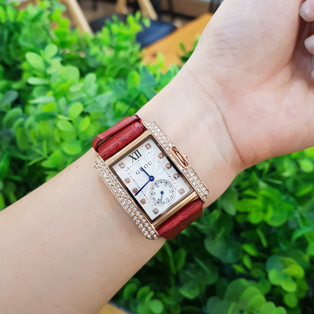 Giới thiệu Đồng hồ nữ Guou chính hãng 8121 mặt vuông viền đá dây da kim rốn sang trọng chống nư