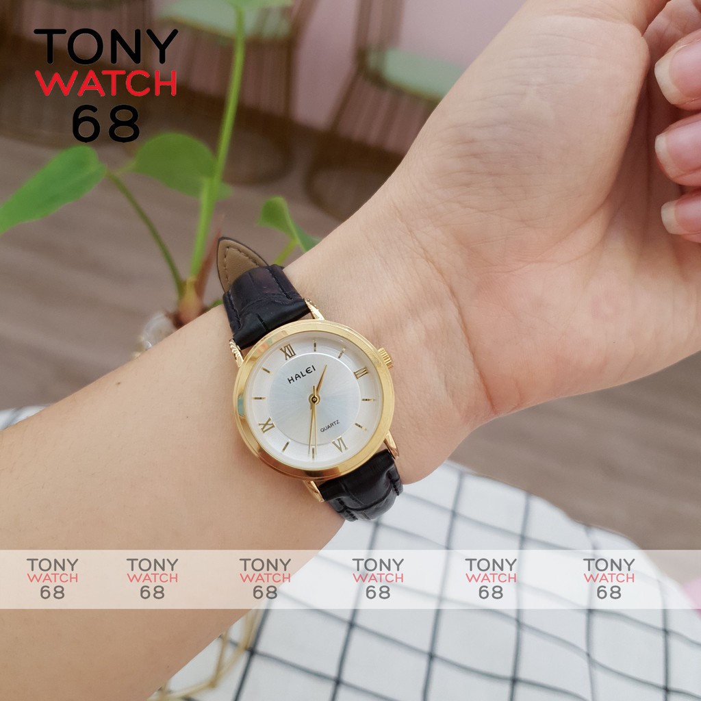 Giới thiệu Đồng hồ nữ Halei dây da mặt vân đồng tâm viền mạ vàng chống nước chính hãng Tony Watch 68