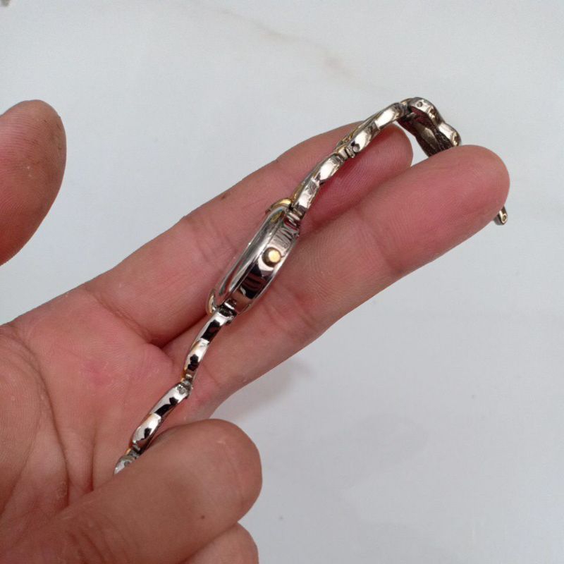 đồng hồ nữ si hiệu ANNE KLEIN dạng lắc demi mặt kính có vài vết xước nhỏ nước si mạ bên ngoài dây có bạc màu xi mạ bên trong có tróc lộ lớp đồng thau size mặt 25.5mm đo cả núm size dây 10mm phù hợp nữ có vòng tay 17cm đổ lại chống nước không bảo hành vì hàng si bảo hành máy 1 tháng