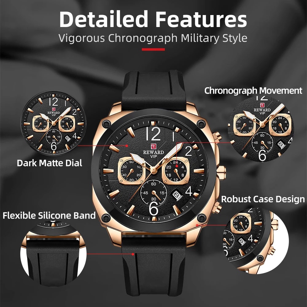 Mô tả sản phẩm: Thương hiệu: Reward - Vỏ hợp kim chất lượng; - Chất lượng dây da - Đường kính vỏ: 4.3cm - Độ dày vỏ: 1.2cm - Tổng chiều dài: 24cm - Chiều rộng dải: 2,2cm - Trọng lượng sản phẩm: 79g