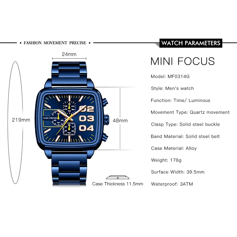 Mô tả sản phẩm: Thương hiệu: tiêu điểm mini Số mô hình: 0314g Phong cách: Kinh doanh Hình dạng trường hợp: Hình vuông Phong trào: thạch anh Loại sản phẩm: Đồng hồ đeo tay thạch anh