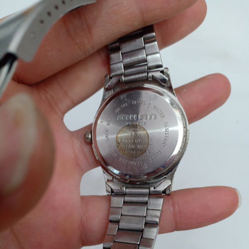 đồng hồ si nhật nam hiệu MILAN 1 cửa lịch độ mới 86% mặt kính có xước nước si mạ có xuống màu mayd hoạt động đubgs giờ size mặt 38.5mm đo cả núm size dây 20mm phù hợp nam có vòng tay 18.5cm đổ lại chống nước không bảo hành vì hàng si bảo hành máy 1 tháng