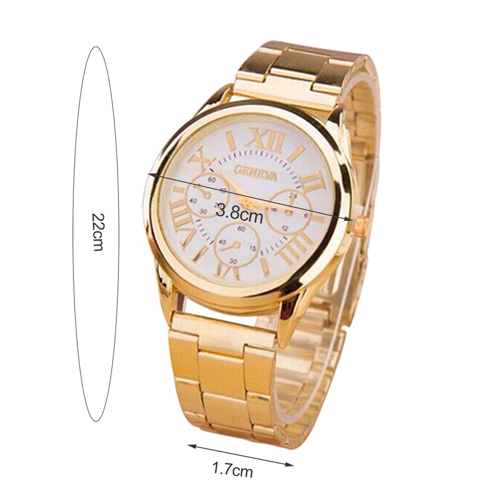 Mô tả: Được thiết kế với các chữ số la mã lớn và tông vàng, đồng hồ khá quyến rũ. Với vẻ ngoài sang trọng và quý phái, sản phẩm là một phụ kiện hoàn hảo cho những dịp khác nhau. Vỏ đồng hồ và dây đeo được làm từ chất liệu hợp kim cao cấp, bộ chuyển động được làm từ thạch anh. Đường kính vỏ là 3,8cm. Chiều dài của dây đeo là 1,7cm và tổng chiều dài là 22cm. Nó phù hợp cho cuộc sống hàng ngày, mua sắm, tiệc tùng, quà tặng, v.v.
