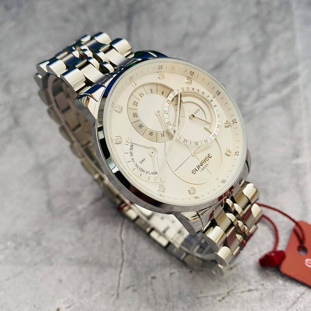 Thông số kỹ thuật Thương hiệu: Sunrise Nhật Bản Máy : Quartz Miyota Nhật Bản Kích thước: đường kính 42mm Độ dày: 8mm Chức năng: xem giờ, Lịch Thứ + ngày Chất liệu vỏ : Thép không gỉ 316L (All Steinless Steel). Đảm bảo không ra ten, không tróc xi Mặt kính : Sapphire Glass (Kính chống trầy). Chống nước : 30 mét (rửa tay, đi mưa, tắm). Tuổi thọ pin: 3 năm