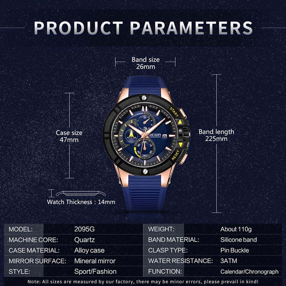 Mô tả sản phẩm ' Thương hiệu “MEGIR Số mô hình: MEGIR-2095 Phong cách thể thao Hình dạng trường hợp 'Tròn Phong trào - Thạch anh Loại sản phẩm 'Đồng hồ đeo tay thạch anh Loại vật liệu ban nhạc 'Silicone Chất liệu vỏ hợp kim Loại vật liệu cửa sổ quay số “Hardlex Chiều dài dây đeo '24cm Chiều rộng dải: 26mm Đường kính quay số '47mm Độ dày vỏ: 14mm Trọng lượng * 110g Độ sâu kháng nước — 3Bar Loại móc khóa
