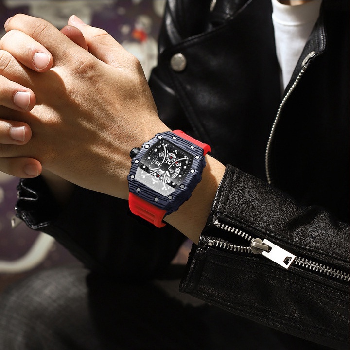 Giới thiệu Đồng hồ thể thao thời trang nam hình thùng đầy màu sắc Dây đeo silicon Mặt số đen đỏ Kim phát sáng Lịch Đồng hồ đeo tay thạch anh