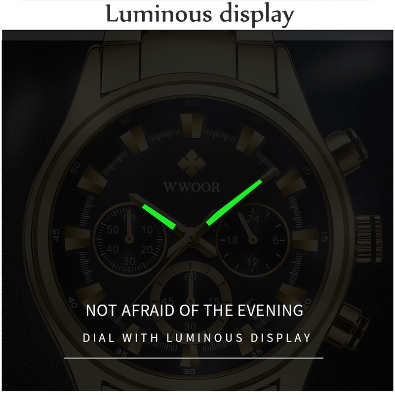 Giới thiệu Đồng Hồ Thể Thao WWOOR Chống Nước Bằng Thép Không Gỉ Mạ Vàng Đen Sang Trọng Cho Nam Giới Relogio Masculino-8857