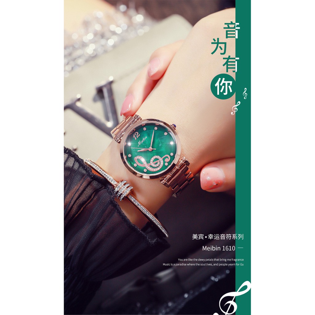 Giới thiệu Đồng hồ thời trang nữ, đồng hồ chính hãng MEIBIN nốt nhạc, mặt tròn đính đá Ruby cực kỳ cao cấp, sang chảnh