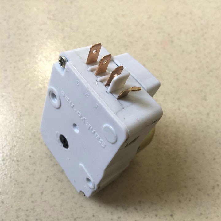 Đồng hồ tủ quầy 802B. Mua càng nhiều giá càng tốt. Tác dụng của đồng hồ thời gian trong tủ lạnh . Có chức năng ngắt điện vào máy nén và cấp điện cho hệ thống điện trở xả đá để tẩy tuyết dàn lạnh. Tùy theo cấu tạo của timer, thời gian xả đá có thể 6h, 8h, 12h, 24h . Thời gian xả đá từ từ 18 – 30 phút. Đồng hồ thời gian hay còn được gọi là rơ le thời gian nó thực sự rất quan trọng trong sự hoạt động của một chiếc tủ lạnh không bám tuyết. Cấu tạo của đồng hồ time : Gồm một động cơ điện xoay chiều một pha M có vòng ngắn mạch có điện áp làm việc như của động cơ máy nén. Trục động cơ qua một bánh răng giảm tốc truyền động cho một bánh cam có tốc độ một vòng trong 24 giờ. Tùy theo sự sắp xếp các vấu trên bánh cam ta có sự đóng ngắt tiếp điểm theo những chu kỳ thời gian nhất định.