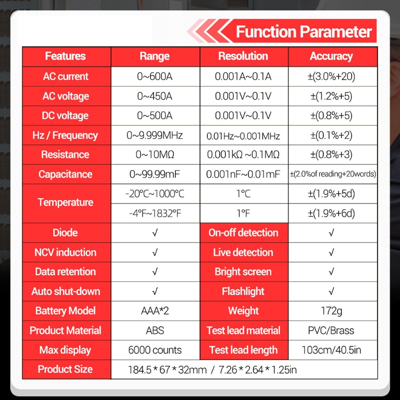Thông số kỹ thuật: Đo lường tự động và đo lường thủ công Quá tải để bảo vệ Điện áp tối đa cho phép giữa thiết bị đầu cuối đo và đất: 600V AC 600V Màn hình: LCD Màn hình: 5999 tối đa Chỉ báo cực: Chỉ báo tự động Thời gian lấy mẫu: khoảng 3 lần / giây Thiết bị hiển thị và hiển thị nguồn Tự động tắt nguồn: 10 phút Hàm mở là 25mm; đường dây thử nghiệm OD nhỏ hơn 23mm Nguồn: Dòng điện DC 3V; Loại: 1.5V AAA Chỉ báo điện áp: Biểu tượng LCD Hệ số nhiệt độ: nhỏ hơn 0,1 Nhiệt độ hoạt động: 18℃ ~ 28℃ Nhiệt độ bảo quản: -10℃ ~ 50℃ Kích thước: 1184.0 × 66.0 × 32.5mm