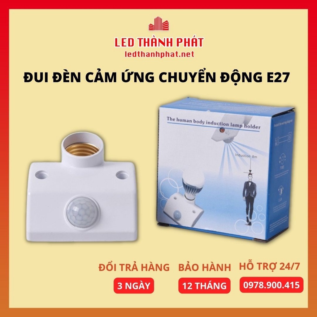#Thông tin kỹ thuật: +Điện áp: AC 220V ~ 50Hz +Công suất tải: max 50w +Loại bóng đèn phù hợp: Led, compact, bóng đèn từ 3W đến 100W +Góc cảm ứng: 120 độ +Khoảng cách cảm ứng: < ~8m +Màu sắc: Trắng +Đui đèn: E27: (đui xoáy fi 27mm) +Kích thước SP: DxRxC=8x8x4cm #Công dụng: +Tự động bật sáng khi có người đi vào vùng cảm biến, tự động tắt khi người rời khỏi vùng cảm biến sau một thời gian ngắn +Tự động làm cho ngôi nhà trở nên thông minh, không cần lắp công tắc, không lo quên tắt đèn, có tác dụng tiết kiệm điện +Đui đèn E27, đuôi xoáy fi 27mm thông dụng cho hầu hết các loại bóng đèn +Sử dụng lắp đặt được mọi nơi như: hành lang, cầu thang, nhà xe, nhà VS, cổng, sân vườn. Sử dụng với mục đích cảnh báo đuổi trộm + Với chế độ cài đặt tại nhà máy đèn chỉ sáng khi có người vào lúc trời tối ( Khoảng 18h30 đến 6 giờ sáng ). Tương đương với ánh sáng dưới 10Lux muốn đui đèn có thểm cảm ứng ánh sáng ở thời điểm sớm hơn ta điều chỉnh trên nút tương ứng của đui đèn. + Có nút chỉnh thời gian sáng từ 10s: 600S (nhà máy cài đặt đèn sáng từ 10s:60s)