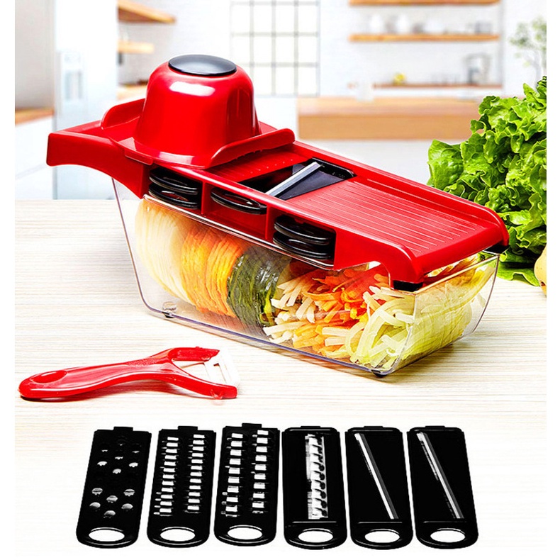 Đặc điểm nổi bật của sản phẩm Dụng cụ giữ củ quả cố định bảo vệ tay bạn an toàn Thiết kế nhỏ gọn tích hợp nhiều chức năng trong cùng một sản phẩm: bào sợi, thái lát, bào khoanh, lược trứng, thau rửa... An toàn và bền bỉ: Chất liệu chống gỉ cao cấp giúp bạn yên tâm về vấn đề an toàn thực phẩm. Ngoài ra còn trang bị dụng cụ giữ rau củ để đảm bảo an toàn tối đa khi sử dụng 6 Lưỡi bào tiện dụng giúp bạn chuẩn bị nguyên liệu chế biến các món ăn ngon miệng, đẹp mắt vô cùng tiện lợi và nhanh chóng. Vệ sinh dễ dàng: bề mặt bóng mịn không bám dính, có thể dùng mút mềm để rửa sạch Thau thái rau củ đa năng với thiết kế lỗ thoát nước độc đáo giúp việc cắt thái và rửa rau củ, hoa quả trở nên dễ dàng hơn