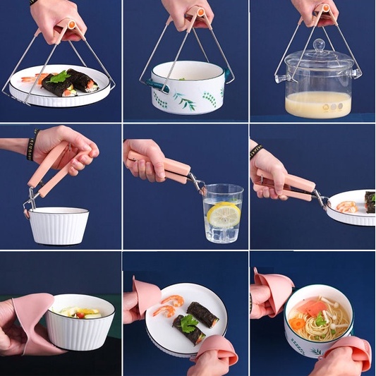 - Kẹp gắp dĩa thiết kế bằng inox và nhựa ABS cứng cáp, như 2 gọng kìm kẹp chặt vào thành dĩa. - Kẹp nhấc tô thiết kế dạng kẹp gắp có lò xo, tay cầm làm bằng nhựa ABS cứng cáp cách nhiệt, thân bằng Inox. - Nhấc tay thiết kế hình mỏ vịt tiện lợi cho việc cầm nắm, dễ dàng tháo ra và đeo vào.
