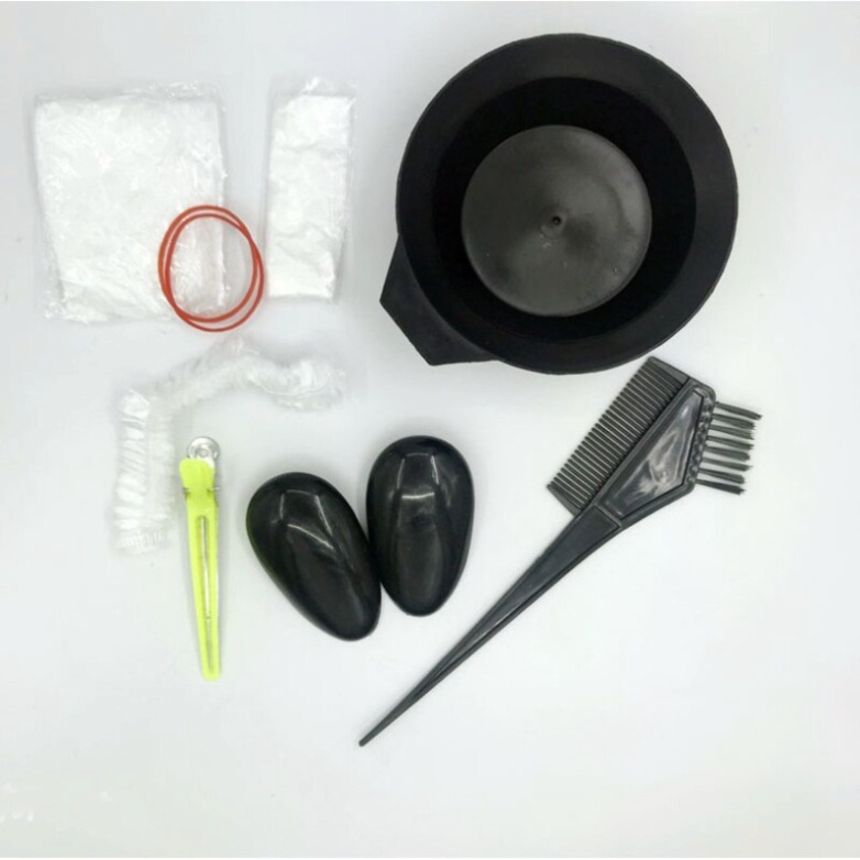Dụng cụ nhuộm: Lược nhuộm tóc 2 đầu, bát nhuộm, mũ ủ tóc nilong. MÔ TẢ SẢN PHẨM Bộ dụng cụ nhuộm tóc chuyên dụng màu đen tái sử dụng được sau nhiều lần nhuộm mà không bị bẩn.