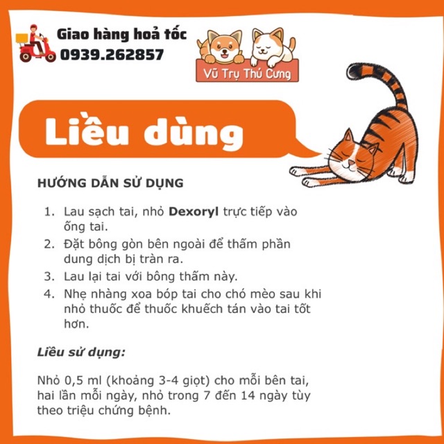 Cách sử dụng: - Vệ sinh tai: Trước khi sử dụng, hãy vệ sinh tai của mèo bằng cách làm sạch nhẹ nhàng với nước và bông tăm. - Cho vào lỗ tai lượng bằng kích thước của một hạt đậu nhỏ mỗi ngày trong 21 ngày. - Làm sạch tai ngoài. Nhỏ một lượng bằng kích thước của một hạt đậu nhỏ Oridermyl vào lỗ tai sau đó Massage quanh gốc tai và làm sạch sản phẩm dư thừa trên nắp tai. - Tuân thủ hướng dẫn: Hãy tuân thủ hướng dẫn sử dụng chi tiết trên bao bì sản phẩm để đạt hiệu quả tốt nhất và đảm bảo an toàn cho chó mèo. ung dịch nhỏ tai cho Chó mèo Dexoryl Virbac | Nước Vệ sinh tai cho thú cưng, chó mèo ❇️ CÔNG DỤNG: Điều tr.ị bệ.nh vi.êm tai ngoài cho thú cưng do vi khuẩn, n.ấm hoặc ngoại ký s.inh trùng gây ra. ❇️ HƯỚNG DẪN SỬ DỤNG Lau sạch tai, nhỏ Dexoryl trực tiếp vào ống tai. Đặt bông gòn bên ngoài để thấm phần dung dịch bị tràn ra. Lau lại tai với bông thấm này. Nhẹ nhàng xoa bóp tai cho chó mèo sau khi nhỏ dung dịch để khuếch tán vào tai tốt hơn.